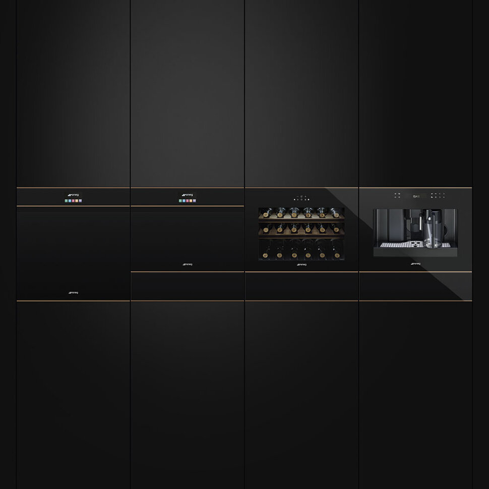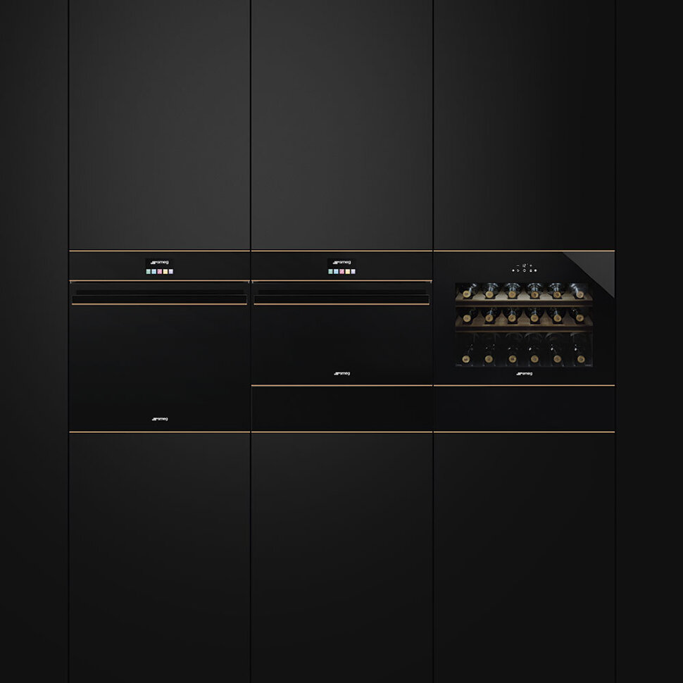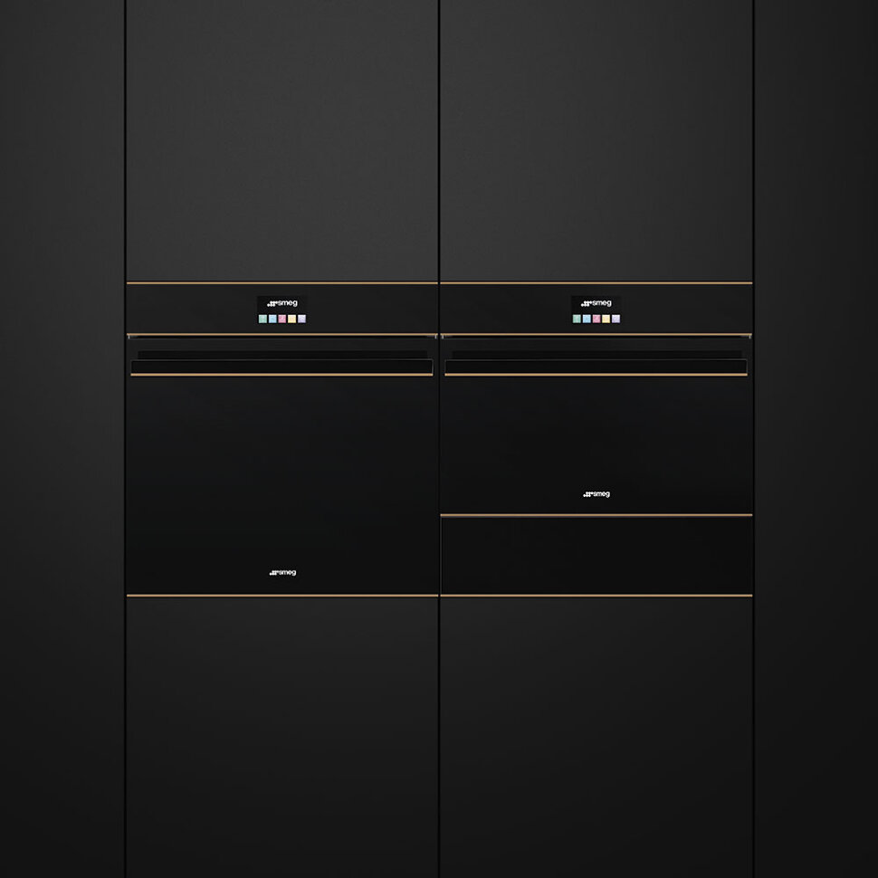 Подогреватель посуды, 60 см, высота 14 см, черное стекло, медный профиль, открывание PUSH