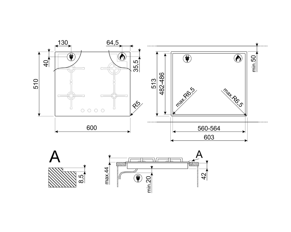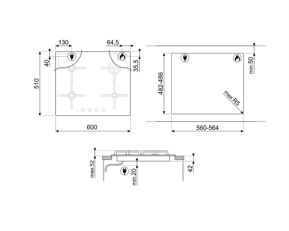 Газовая варочная панель, 60 см, Цвет кремовый, прямой край
