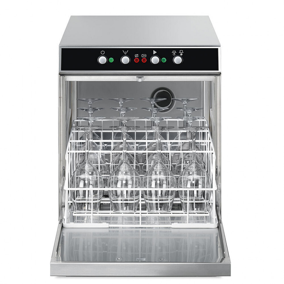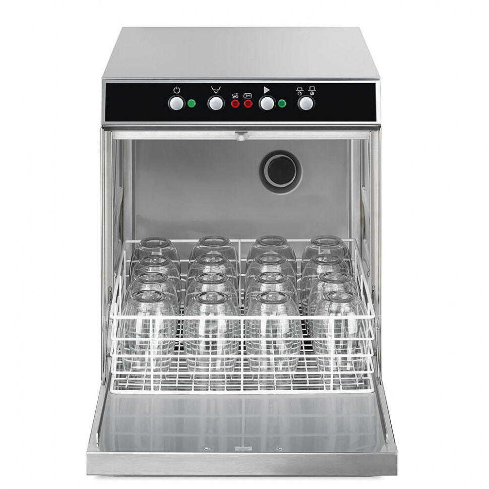 Стаканомоечная машина электромеханическое управление серия ECOLINE с фронтальной загрузкой для кассет 400 х 400 мм, высота ПММ 670 мм, встроенный водоумягчитель.